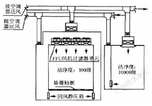 第三種方式,萬級區潔凈房間內含局部百級區。此種情況在藥品生產廠房潔凈區內也比較多見。這種情況,局部百級區面積一般在10m2 以內。可以利用萬級凈化空調系統送風控制室內溫、濕度,補充新風。在局部百級區加大循環風量。循環風處理方式可以采取前述方式 一,即在局部百級區吊頂內作靜壓箱,百級區范圍內滿布FFU,利用FFU處理循環風,如圖3。循環風處理方式也可采取前述方式二,即在局部 百級區吊頂內作靜壓箱,百級區范圍內滿布高效過濾器,利用循環風機加壓,如圖4。